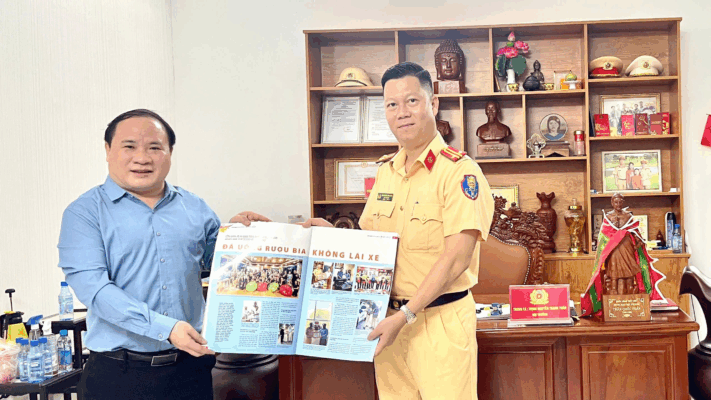 BTV Phạm Đình Vương tặng Tạp Chí Sức Khoẻ Cộng Đồng cho đ/c Nguyễn Hoàng Phúc – Cán bộ Đội tuần tra kiểm soát giao thông đường bộ cao tốc số 06 – Phòng HDTTKSGTĐB. Cục Cảnh sát giao thông đường bộ. Bộ Công an